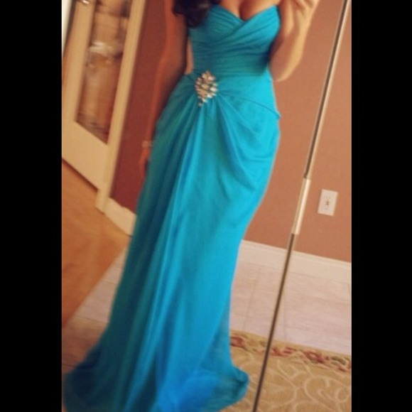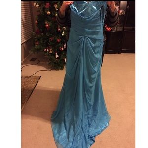 Beautiful blue gown, gathering on hip with broach, some alterations so make the fit closer to a size 4. Only worn once, dry cleaned and in perfect condition.