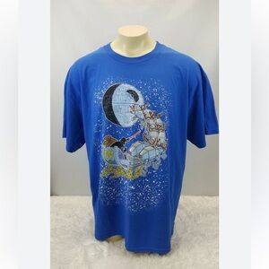 Vibrant blue t-shirt featuring a unique graphic of Santa's sleigh flying past the moon. Perfect for casual wear.