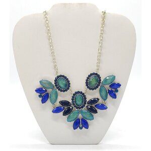 This bold statement necklace features vibrant blue and green gemstones framed by a silver-tone chain, offering a versatile and stylish accessory.
