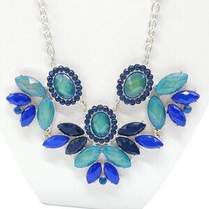 Blue Green Acrylic Statement Flower Necklace With Silver Chain Lobster Clasp