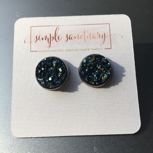 Blue green faux druzy stones in 12mm gunmetal settings. Comes with plastic earring backs and on earring cards.