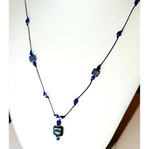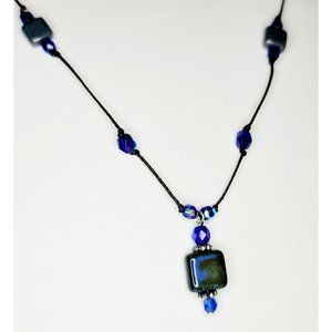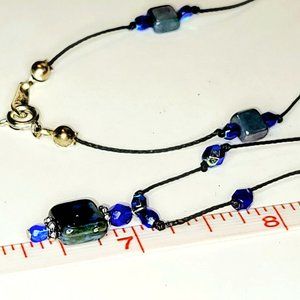 Blue glass beads with blue and green central bead on this pretty fashion necklace