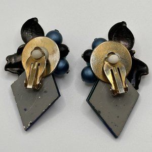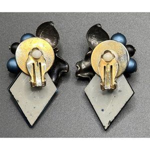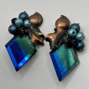 These beautiful earrings feature beads in shades of blue with a diamond shaped glass stone and antiqued copper leaves, creating a stunning floral design. The clip-on closure makes them easy to wear, and the glass material adds a delicate touch. Perfect for adding a pop of color to any outfit, these vintage earrings are a must-have for any jewelry collection.