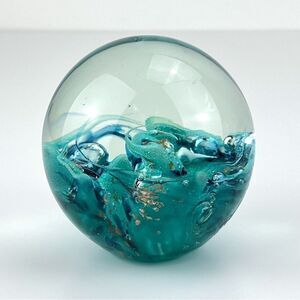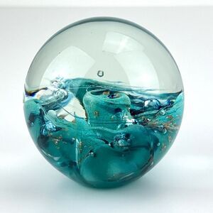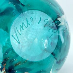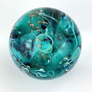 Blue Green Round Shaped Art Glass Paperweight by Roger Vines 1999