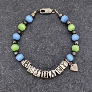 Description: Add a touch of shimmering elegance to your wrist with this Vintage Sterling Silver 925 "Bethany" Beaded Bracelet. Crafted with exquisite blue-green beads, this bracelet exudes charm and sophistication. The sterling silver 925 charms spell out "BETHANY," adding a personalized touch to this timeless piece. With a length of 6" and a weight of 12 grams, this bracelet is both comfortable and stylish to wear. Perfect for adding a pop of color to any outfit, this bracelet is sure to become a cherished addition to your jewelry collection. Please consider the photos as part of the description. The item is in good vintage condition.