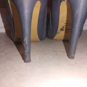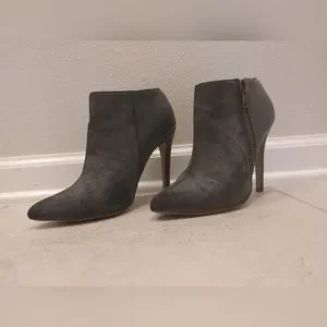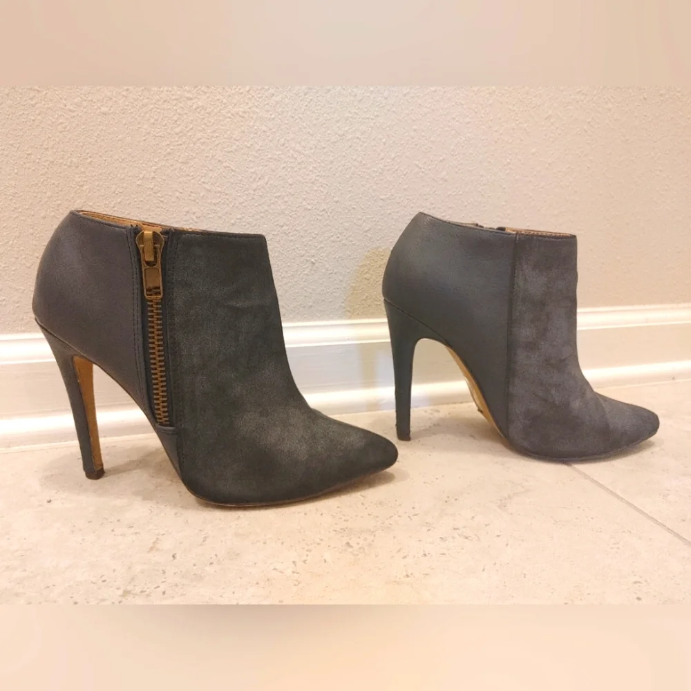 These booties look great with pants or skirts. gold zipper on side. 2 tone faux leather and fuax suede. I think they're more blue or navy than grey but its a color that depends on person and lighting I guess. the last pic shows the color really well. the heel of the left is a little scuffed. see pics for details.