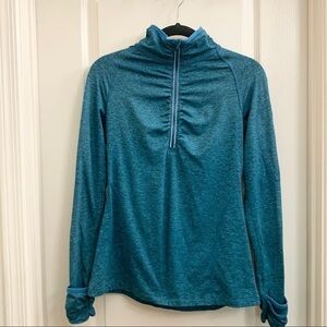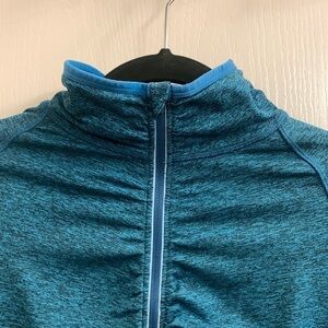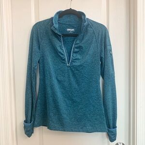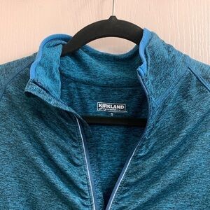 Kirkland Blue Half Zip Running Jacket - Long Sleeve Pullover Size S. Excellent condition. Soft and flattering 1/4 zip long sleeve pullover shirt for any athletic activity or just lounging. Sturdy zipper with reflective strips, extra long sleeves with cuff and thumb hole. Convenient side zipper pocket on sleeve.