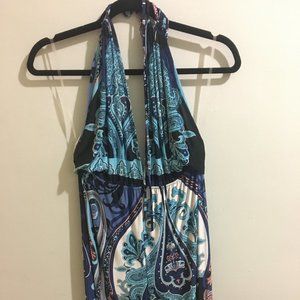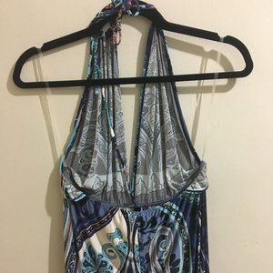 JVGrabs -Halter top wide leg Ocean blue Romper, it has all different beautiful shades of blue and designs, it's very long. Will fit perfectly on a female with height of 5'5". 92% Polyester 8% Spandex - Size - L - Condition: Brand New