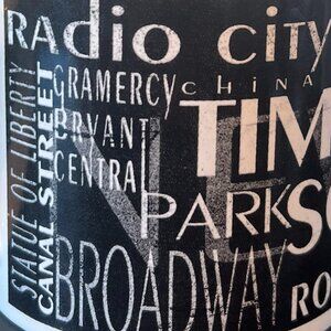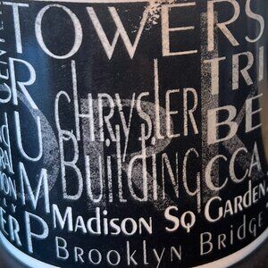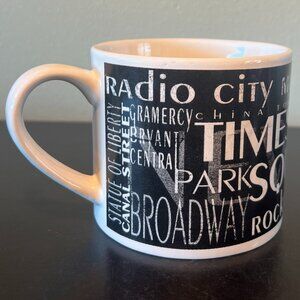 New York City landmark souvenir oversized coffee mug, features a wraparound "wallpaper" design with the names of iconic NYC places and buildings in a bold, black and white typographic layout against a dark brown background. Includes: TIMES SQUARE; STATUE OF LIBERTY; CANAL STREET; BROADWAY, CHINA TOWN; ROCKEFELLER CENTER; LITTLE ITALY; GRAND CENTRAL STATION; BROOKLYN BRIDGE; TRUMP TOWERS; CHRYSLER BUILDING; MADISON SQ GARDEN; BROOKLYN BRIDGE; LINCOLN CENTER; ELLIS ISLAND; RADIO CITY MUSIC HALL; EMPIRE STATE BUILDING; and THE MET. White interior. Large and comfortable easy-to-grip handle. Durable and heavy weight. Microwave safe. Measures 3.75” tall with a 4.25” diameter. 6.25’ across including the handle. Holds 20 fluid oz. From Blue Harbor Collections; SD Graphics; Housewares International.