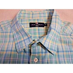 The Blue Harbor Summer Cotton blend Short Sleeve Shirt in XL Blue is a classic plaid button-up shirt perfect for the summer season. Made from a comfortable cotton blend material, this shirt features a collared neckline, short sleeves, and a spread collar style. The shirt has a regular fit, pockets, and a woven fabric type, making it a stylish and practical addition to any man's casual wardrobe.