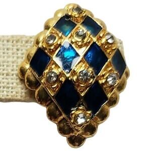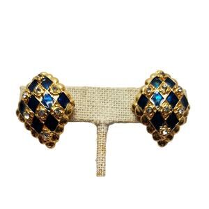 Blue Harlequin Clip On Earrings Rhinestone Enamel Gold Tone Diamond Shape 1980s
