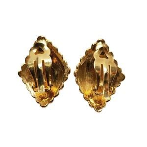 Gorgeous pair of vintage clip on earrings. The diamond shape gold tone earrings have clear rhinestones and blue enamel accents. The earrings are unsigned.