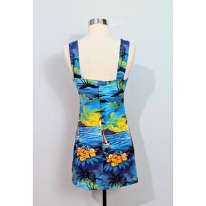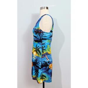This dress is a stretchy polyester/lycra blend that will breathe well! The colors are vibrant and fun. A perfect beach dress! 90% Polyester 10% Lycra. Marked size M. No noted flaws!