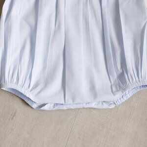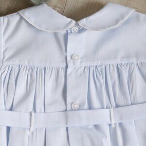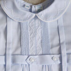 This Boys Heirloom Romper is Gorgeous, Heavenly Sweet! The romper is done in a sweet Pastel Blue cotton/poly blend for easy care. The Peter Pan Collar is trimmed in a white embroidered ladder stitch. An embroidered scalloped, dotted garland done in white, adorns both sides of the collar. 2 groups of tiny hand-stitched Pintucks are placed in the center of the chest. Between the groups is a hand-faggoted inlay done in white stitching & has vertical scalloped white dot garlands on each side, matching collar details. Narrow pleats start at the shoulders on both side and extend down to the legs. The pleats have a "pass through" for the matching belt, a very unique feature. The belt buttons in the front. Embroidered white belt loops in back hold belt in place. Short sleeves are cuffed and have white embroidery, matching the collar trim. Snap inseam makes for easy changes.Back has a yoke and button closure. New with Tags!
