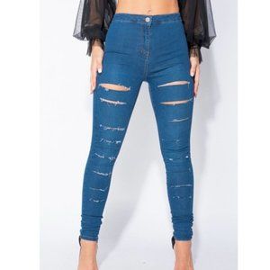 Blue High Waist Ripped Distressed Skinny Denim Jeggings Pants