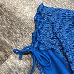 Stylish blue high-waisted bikini bottoms with lace-up sides. Perfect for a chic beach look.