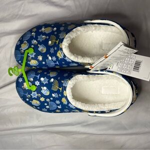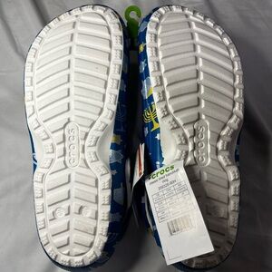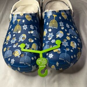 Festive blue clogs with holiday patterns. Comfortable and stylish.