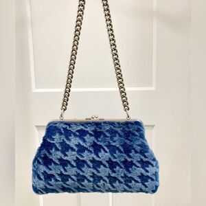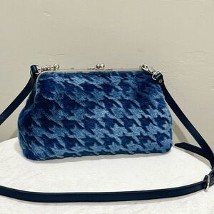 Blue Houndstooth Genuine Shearling Leather Kisslock Handbag, Multi Use Style
