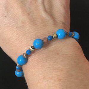 Memory wire with 8mm & 4mm genuine semi-precious round beads. Blue Howlite (dyed) & Leopardskin Jasper.