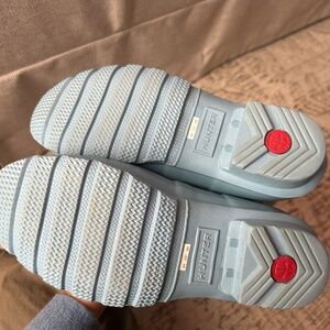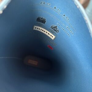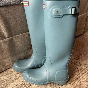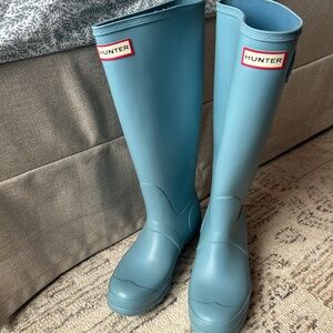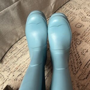 Gently worn hunter rain boots in matte blue color.