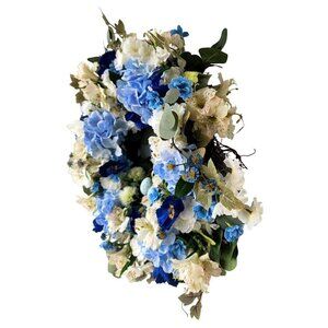 This Blue Hydrangea wreath, curated by Flower Barn, Handmade by Robin, is the perfect front door adornment. It features poppies, a birds nest, and faux robin eggs, offering a spring, cottage-style look that transcends seasons.