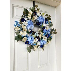 Blue Hydrangea wreath with poppies, birds nest and faux robin eggs. Beautiful!!