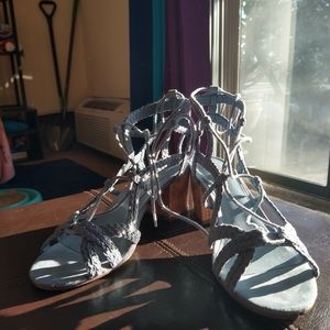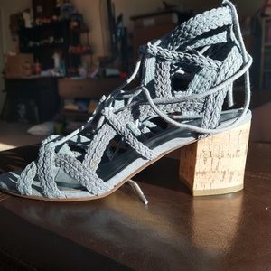 Blue Indigo Rd. Sandals, Lace-up with chunky 2-3" block heel. Cork and fabric. Only worn twice. Excellent used condition. Size 7.5.
