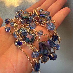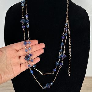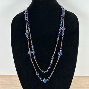 Blue Iridescent Plastic Beads Double Gold Tone Chain Necklace Vintage Style 36"
