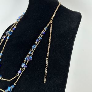 Blue Iridescent Plastic Beads Double Strand Gold Tone Chain Necklace, Vintage Style. Unmarked.