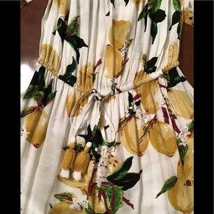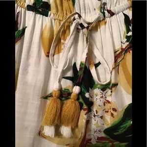 Lemon Print Drawstring Off Shoulder Dress/ Cover-up Gorgeous neutral colors of mustard yellow, lemon yellow , green, black, and brown-red on a white background. Pair it with a big straw hat and hobo beach bag and your ready to go from the beach, pool or right to dinner and drinks with friends. Very versatile. Brand new with tags