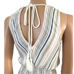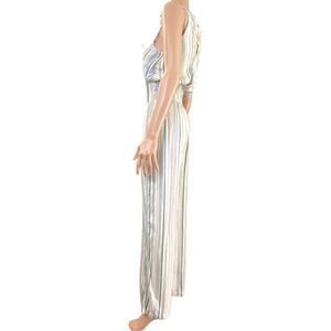Sail into style with this stunning Blue Island striped jumpsuit in size XS — a must-have for your cruise capsule or warm-weather escape. This lightweight, breathable 100% rayon piece features a multicolor stripe pattern in blush pink, sage green, cream, gray, metallic gold, and deep charcoal or black. The soft shimmer throughout adds just the right touch of glam.