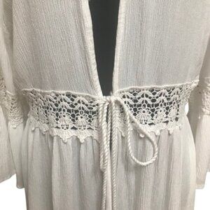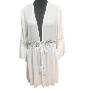 Blue Island Women's Crochet Trim White Swim Cover Up features Bell Sleeves and a tie closure with tassels. Excellent Pre-Owned Condition