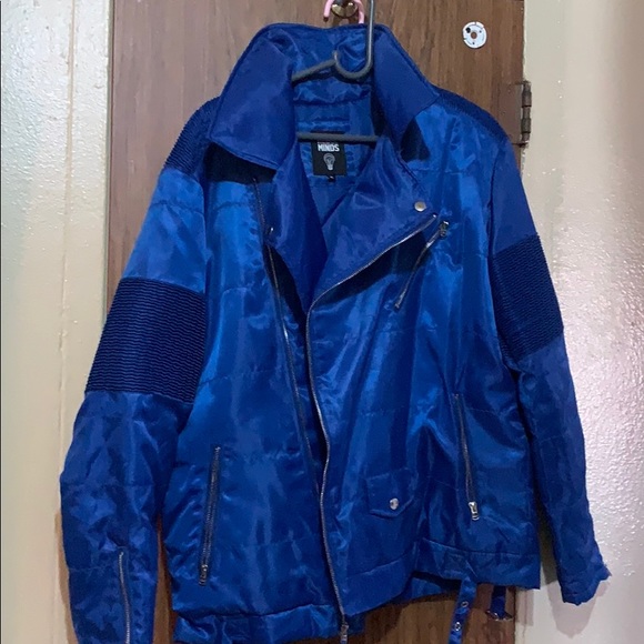 Blue puffy jacket, nice style and lots of pockets and zippers