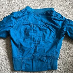 Bright Blue Jacket- Light Jean Material- Tip on Inside (see photo)- Sweater Like @ wrists/ neck and bottom of jacket- size Small - Functioning Zipper