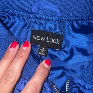 Blue jacket white accents, offering a stylish and sporty look. The lightweight material and zip-front closure make it perfect for casual outings, while the double-striped sleeves add a distinctive touch. More of a cropped jacket look to it. Or for kids. Depending on how tall you are