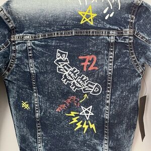 This blue jean jacket features a classic design with a distressed acid-washed finish that gives it a vintage appeal. It is adorned with vibrant embroidered floral and star-like patterns, adding a unique touch to the overall look. The long sleeves complete this stylish outerwear piece.