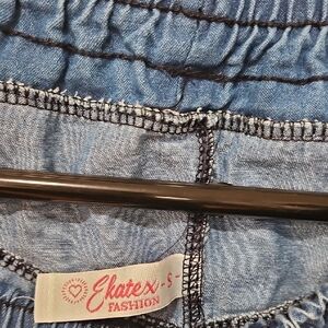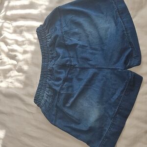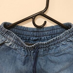 These blue jean shorts feature a comfortable elastic waistband and a relaxed fit, perfect for warm weather wear. The medium-wash denim offers a classic look with a slightly faded appearance.