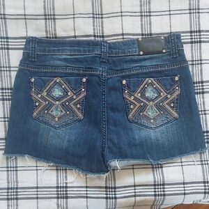 These blue jean shorts feature a casual frayed hem and a medium wash with subtle fading for a relaxed, stylish look. Perfect for warm weather outings, they offer a comfortable fit and a classic denim texture. Size 10/12 Waist flat 16".