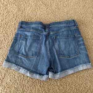 These blue jean shorts boast a rolled hem and a naturally faded appearance, perfect for a laid-back style. The medium-to-light blue color adds a versatile touch to any casual outfit.