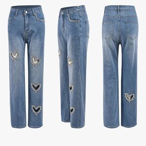 Stylish blue jeans featuring heart embellishments. Perfect for a trendy look.