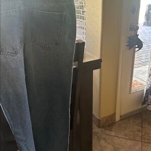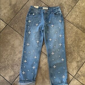 Stylish blue jeans featuring white embroidered patterns. Perfect for casual wear.