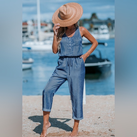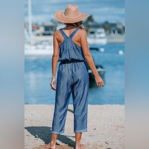 New with tags! Blue jumpsuit with pockets. Comfortable and light material (50% polyester and 50% rayon).