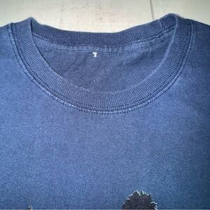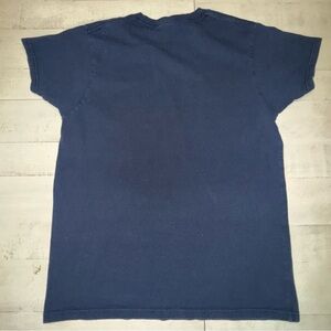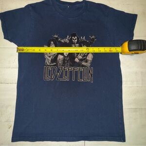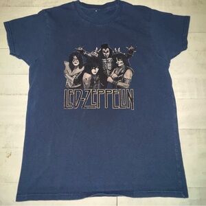 Blue t-shirt featuring a KISS/Led Zeppelin graphic design. Perfect for music fans.