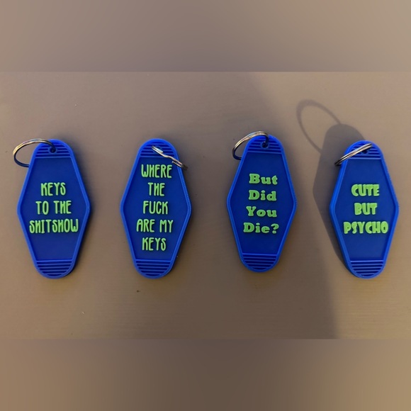 Set of blue keychains featuring humorous text. Perfect for adding a touch of fun to your keys.