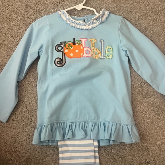 Adorable blue kids matching set featuring a playful 'gobble' design. Perfect for festive occasions. Soft and comfortable for all-day wear.
