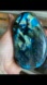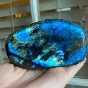 Stunning blue labradorite freeform stone with iridescent flashes. Perfect for meditation or display.