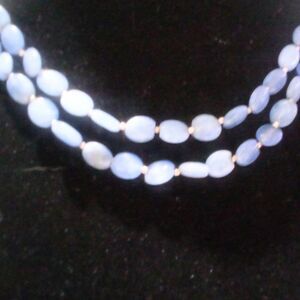 This elegant necklace features two delicate strands of oval-shaped Blue Lace Agate beads, each separated by subtle silver‑tone spacer beads for a refined touch of shimmer. The soft, sky‑blue hues and banded patterns of the agate lend a serene, feminine quality, while the multi‑strand design adds depth and sophistication. Measuring 15″ at the shortest strand, it sits gracefully at the collarbone and fastens securely with a polished circular hook clasp. In beautiful condition, this piece is a timeless accent that complements both casual and dressy ensembles with effortless charm.
