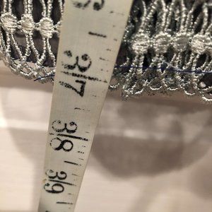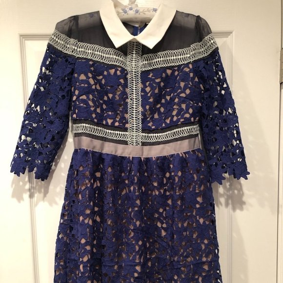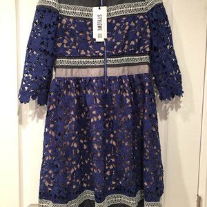 This is a beautiful special occasion dress of blue lace overlay. Sheer black on bodice and shoulder,again at hem. Silver thread trim accents on top, waist and hem. White collar. Length from Shoulder to hem is 37" Originally $64. New, with tags. StyleWe designer dress.