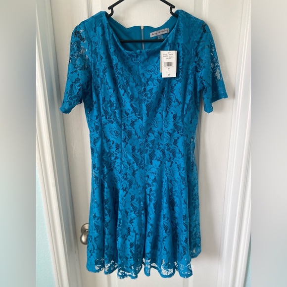 Elegant blue lace dress with short sleeves. Perfect for any occasion.