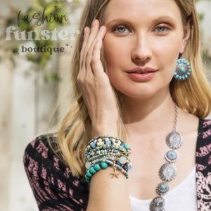 The “Blue Lagoon” 10 piece stackable bracelet set is an instant, ready-to-wear collection of boho beach-inspired arm candy designed to put you on “island time.” Wear them all together, alone, or mix and match with other bracelets to create a unique, creative, on-trend look. Made from materials of different textures that include a mix of heishi, wood, glass, faux pearl, natural stone, mixed metals and ocean-themed charms featuring a starfish, sand dollar and sun Elastic, slip-on style Bracelets vary slightly in size to create a multidimensional and effortlessly chic layered look 2.5”-3” inner diameters unstretched Comfortably fits a 6”-7” wrist All measurements approximate Handcrafted in India Nickel/lead compliant Not intended for children under 12 years due to the small parts/beads beachy, sunny, fun, unique, bright, beaded, stackable, layered, elastic, nautical, vintage, antique, dark, light, wooden, mixed, metal, gold, silver, golden, coastal, bohemian, white, faux, pearl, lapis, turquoise, ocean, blue, summer, beach, boho, lagoon, island, vacation, hippie, gypsy, mermaid, surfer, girl, cowgirl, chic, wood, heishi, glass, natural, stone, pearl, starfish, sand dollar, sun, sunshine, honeymoon, resortwear, yachtwear, yacht, resort, cruise, sailing, wear, stacked, layer, stack, arm, candy, party, layering, style, wanderlust, fashion, stretch, stretchy, boho, coin, charm, bead, amulet, statement, stack, bracelet, bracelets, stack, accessory, charms, outfit, set, collection